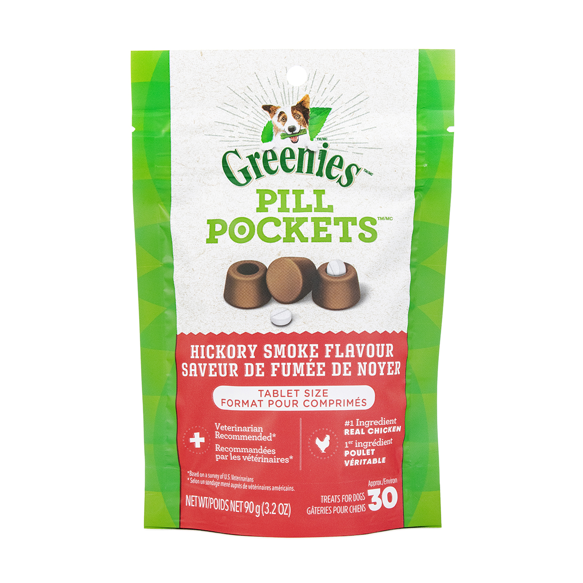 Even the least picky dogs seem to sense medicine tablets from miles away. Give your pet GREENIES™ PILL POCKETS™ Treats for Dogs and skip all of the mess and stress. Once your dog smells the savory hickory smoke flavor of this delicious, low-calorie treat, they won't think twice about taking their meds. They'll be happy and feel rewarded, while you'll get to enjoy the reward of a satisfied pup. Ingredients: Chicken, Glycerin, Wheat Flour, Wheat Gluten, Vegetable Oil, Dried Corn Syrup, Caramel Color, Natural Flavor, Natural Hickory Smoke Flavor, Water, Citric Acid (preservative), Mixed Tocopherols (preservative), Vinegar, Rosemary Extract GUARANTEED ANALYSIS: Crude Protein (Min.) 11.00% Crude Fat (Min.) 10.00% Crude Fiber (Max.) 1.00% Moisture (Max.) 31.00%